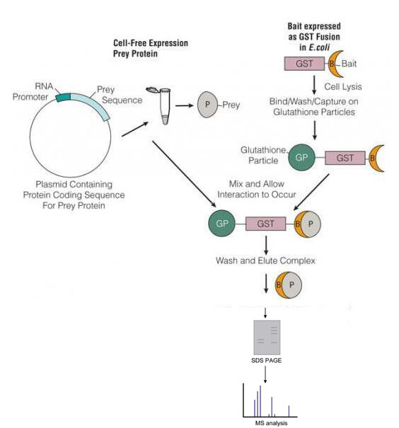 Pull-down技術(shù)與Co-IP非常相似,只不過(guò)后者是用抗體交聯(lián)磁珠或agarose ,pull-down是用固相化的、已標記的餌蛋白或標簽蛋白(生物素-、PolyHis-或GST-),從細胞裂解液中釣出與之相互作用的蛋白(對混合液中的所有蛋白)。通過(guò)Pull-down技術(shù)可以確定已知的蛋白與釣出蛋白或已純化的相關(guān)蛋白間的相互作用關(guān)系,從體外轉錄或翻譯體系中檢測出蛋白相互作用關(guān)系。聯(lián)用高分辨率質(zhì)譜對pull-down拉下來(lái)的蛋白復合物進(jìn)行進(jìn)一步鑒定,就能檢測出與靶蛋白相互作用的蛋白質(zhì)。